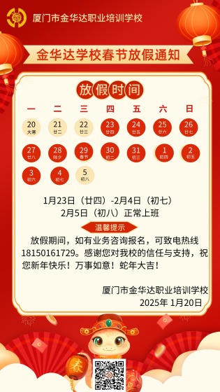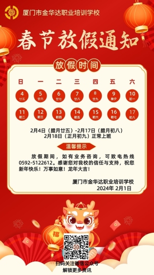 通知根据厦门市应对新冠肺炎疫情工作指挥部〔2021〕 第7号通告,近期所有的培训、考试全部取消,具体恢复时间等政府部门通知,感谢大家对学校的支持。厦门市金华达职业培训学校2021年9月14日