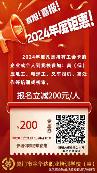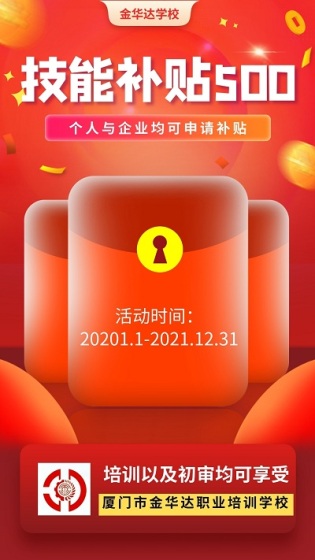 通知: 2020年1月1日至2021年12月31日,在厦门市取证的初审学员,可持本人身份证复印件、个人银行卡号(最好是工商银行,非工行要具体支行)复印件,特种作业证复印件。到厦门市金华达职业培训学校提交材料(周一至周五早上8点-12点,下午14;30-18;00,周六早上8点-12点)一个人可报销500元,一个工种初审只能补贴一次,最多可补贴三个工种,只限初审!培训地点:总部:思明区长青路劳动力大厦5楼520室岛内培训基地:湖里区火炬北路15号之一(11路、302路、657路公交车站)翔安培训基地:厦门市翔安区人力资源大厦正大门对面集美杏林培训基地